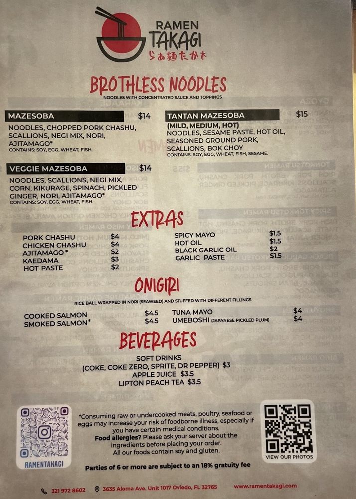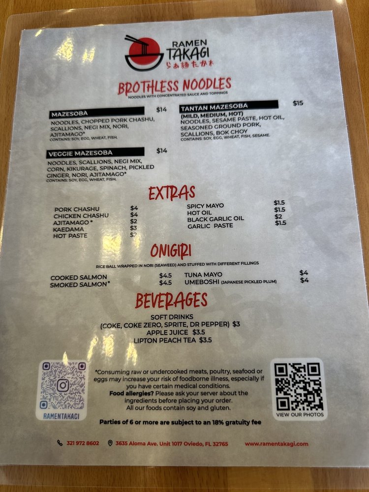 Ramen Takagi, located in Oviedo, FL, is a Japanese Ramen restaurant that offers a variety of dishes such as Fried Chicken Karaage, Gyoza, Noodles, and Onigiri. Known for its authentic Japanese food made with fresh and high-quality ingredients, Ramen Takagi has received raving reviews from satisfied customers. The spicy Tonkatsu Ramen and vegetarian options like the veggie mazesoba are highly recommended. The broth is described as rich and flavorful, and the portion sizes are generous. Despite the small setup, the cozy atmosphere adds to the overall dining experience. The staff is friendly and attentive, making customers feel welcome. Whether you're a ramen enthusiast or looking to try authentic Japanese cuisine, Ramen Takagi is a must-visit spot for delicious and satisfying meals.